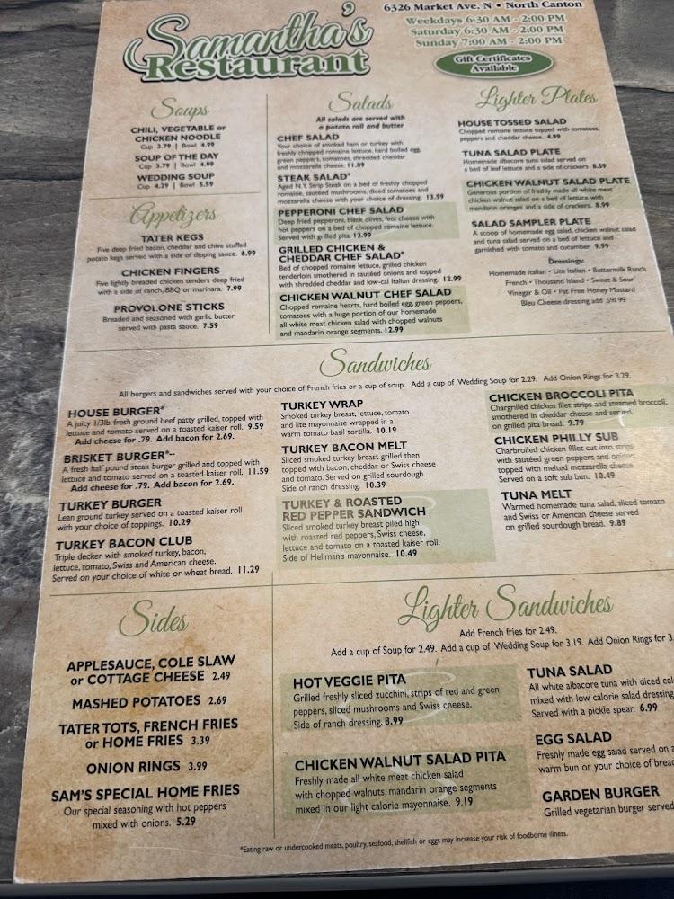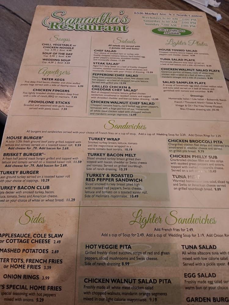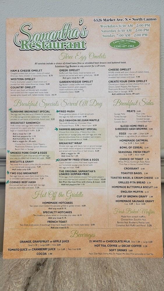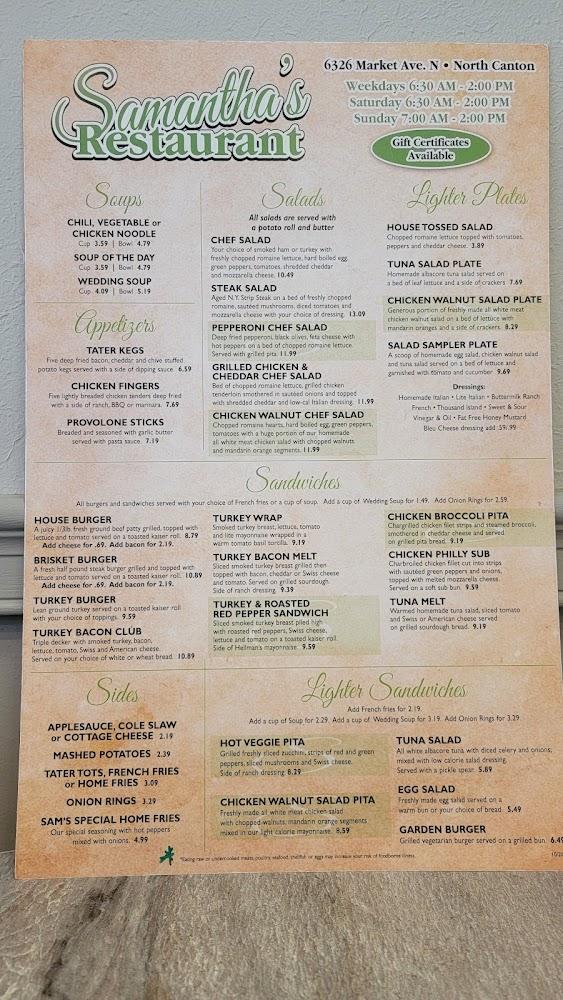 Welcome to Samantha's Bar and Grille, your local North Canton gem! Located at 6326 Market Ave N, we offer a delightful dining experience featuring a diverse menu perfect for breakfast, lunch, and dinner. Enjoy our excellent coffee, extensive tea selection, and refreshing cocktails in a relaxed atmosphere ideal for solo diners and groups alike. With options for takeout and delivery, plus accessible seating for everyone, we strive to make every visit enjoyable. Join us for hearty meals, quick service, and a welcoming ambiance. Reservations are welcomed, and we’re ready to serve you!